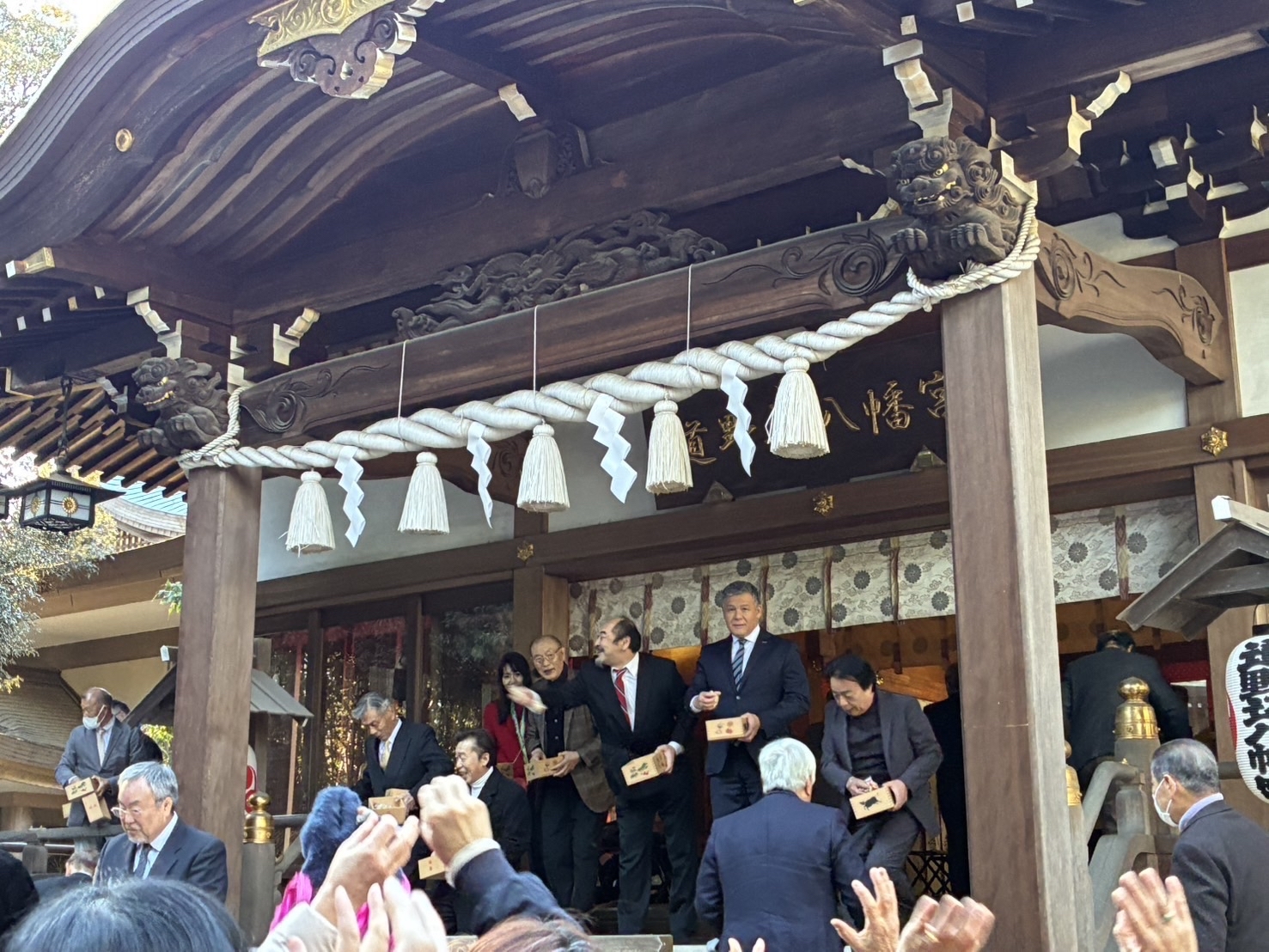 この厳かな神事において、弊社代表の渡邉が神社の総代として参加させていただきました。当日は「皆様の厄を払い、今年一年の福を呼び込むように」との願いを込め、境内に集まった皆様へ向けて力強く豆まきを行いました。地域の方々の笑顔に触れ、私共も改めて身の引き締まる思いがいたしました。